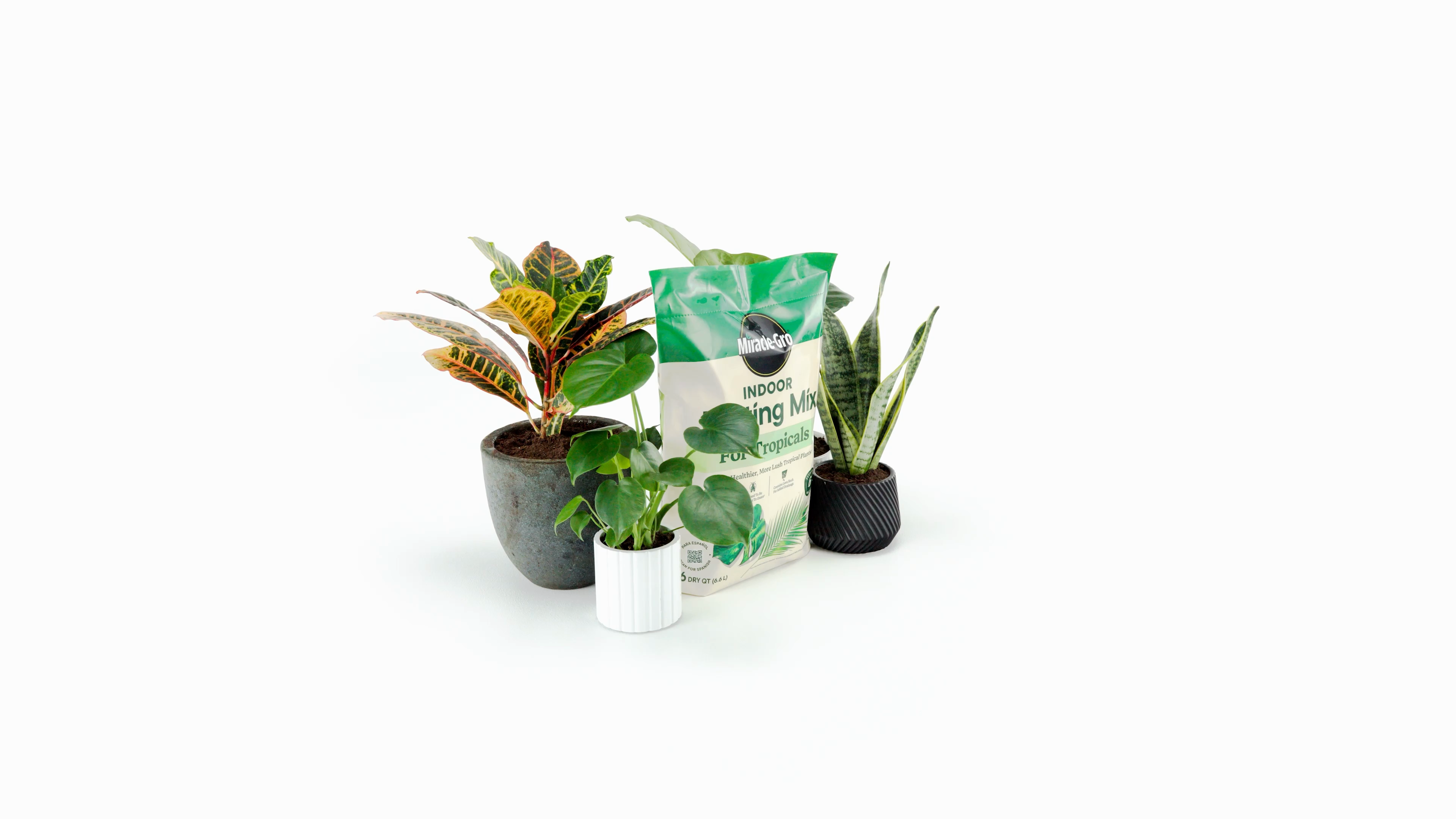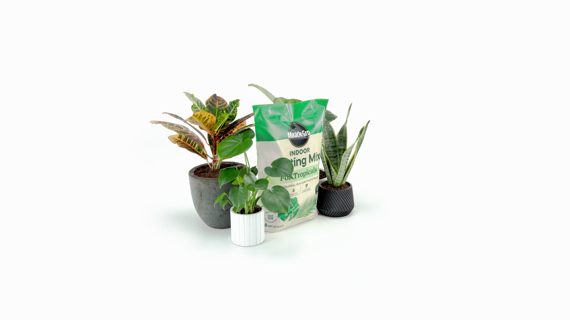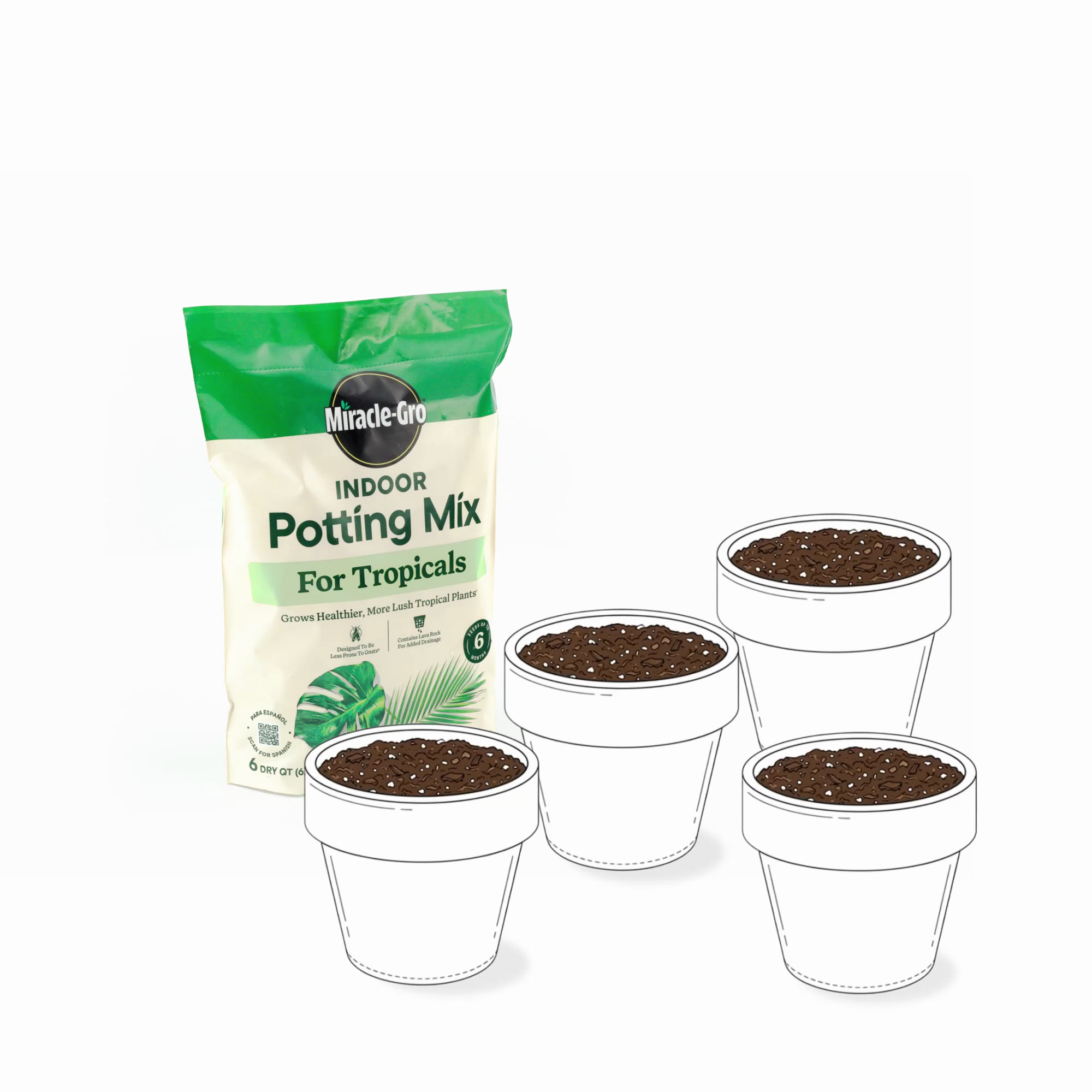 Grow a lush indoor jungle filled with tropical houseplants. Miracle-Gro Indoor Potting Mix for Tropicals is a perfect soil for your indoor tropical houseplants. It’s a pre-mixed, nutrient-rich formula that feeds for up to 6 months, helping you get healthier, more beautiful plants (vs. unfed). We've included lava rock to ensure the soil has the excellent drainage that's so important for their roots, and because we know how annoying fungus gnats can be, we've made sure this mix contains no compost or bark, which are known to shelter them. It's the perfect way to give your tropical beauties - like monsteras, pothos, fiddle leaf figs, calatheas, elephant ears, and palms - a happy home.