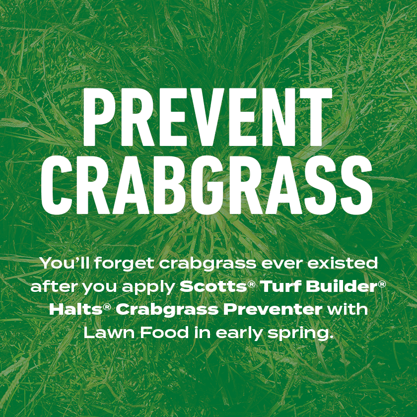 PREVENT CRABGRASS: You’ll forget crabgrass ever existed after you apply Scotts® Turf Builder® Halts® Crabgrass Preventer with Lawn Food in early spring. This product kicks off your year of multi-feeding by preventing crabgrass growth and feeding your lawn for a vibrant green-up after winter.