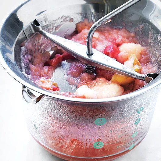 To purée apples and strain out skins, use a food mill with the fine disk, as shown, or push apples through a medium sieve with a wooden spoon. (Martha uses this method: She removes the skins post-cooking and lightly mashes the apples for a clear, not cloudy, sauce; she doesn’t mind a few lumps.)