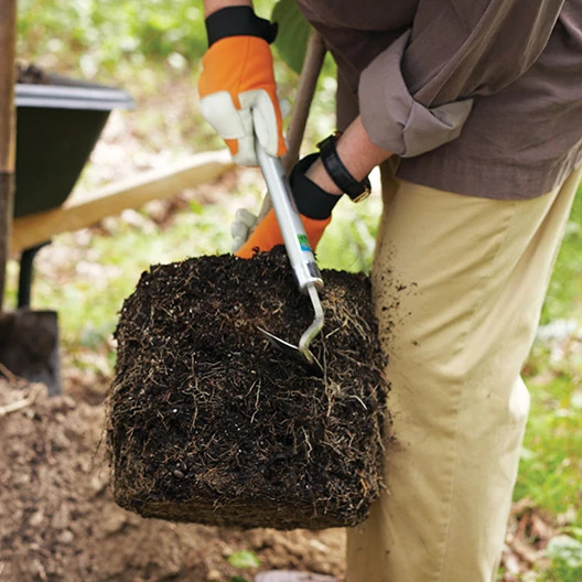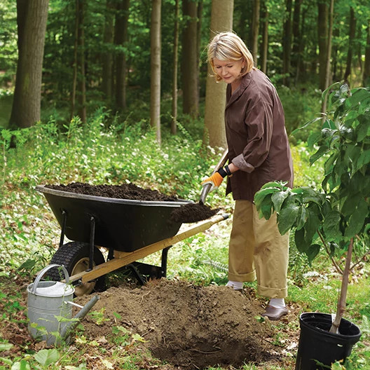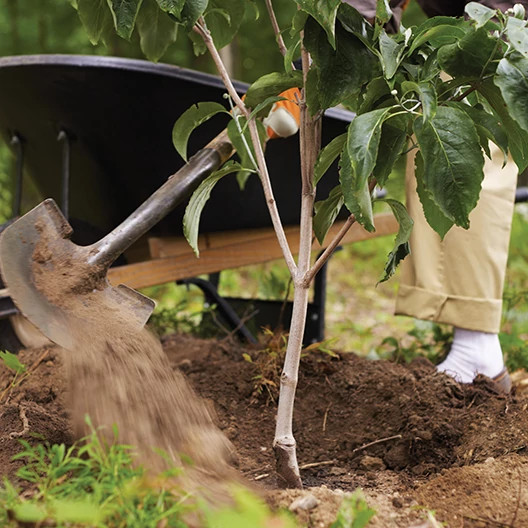 1. Using a sharp spade, dig a hole roughly three times the diameter of the container and just deep enough to let the tree's buttress (the swelling at the base of the trunk) sit about 1 inch above the surface of the soil. The hole should have sloping sides to allow the roots to grow properly. Mix a few shovels of new nutrient-rich Miracle-Gro® Garden Soil Tree & Shrub into the hole.