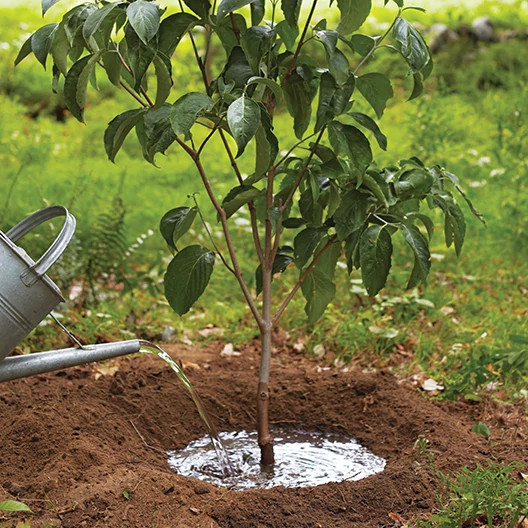 6. Water thoroughly right after planting, then apply a 2- to 3-inch layer of organic mulch to slow evaporation and keep roots cool, leaving a 2-inch buffer around the trunk. (I like using Miracle-Gro Organicâ„¢ All Natural Mulch). Sculpt a "water well" to help prevent runoff so water drains directly into the plant. Give the new tree 1 inch of water a week through its first season.