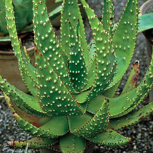 Many people are familiar with aloe vera, but the Aloe genus includes many other varieties with interesting leaf shapes and spine patterns. I love adding new ones to my collection. This Aloe peglerae, right, has modified spines and a wonderfully bumpy, thorny, frightening appearance.