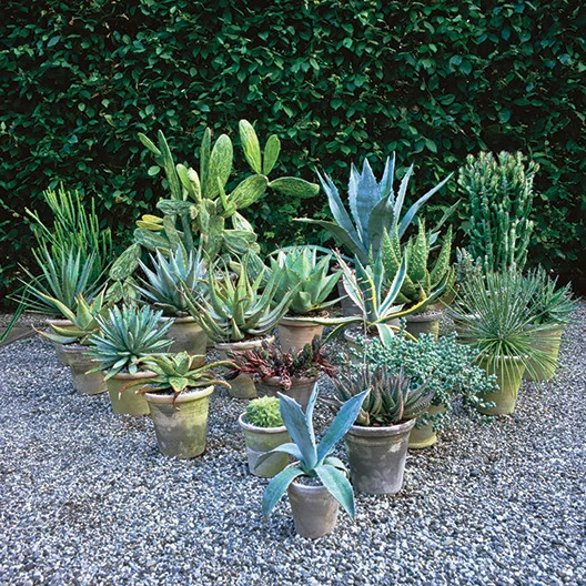 Arranging succulents in a triangle with the tall plants in back and the little ones in front, lets each plant show off its unique form and texture. (The large variegated opuntia in the last row is especially beautiful.) The composition also works from a distance, forming a dynamic display that’s visible from the house.