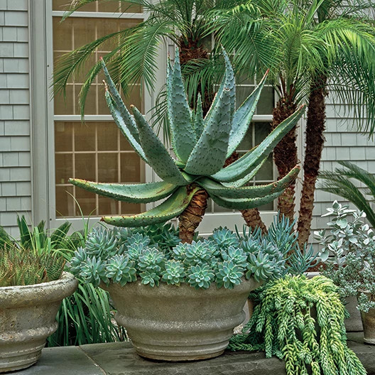 I often plant several succulents in a single container. Aloe is underplanted with echeveria, right. Both are silvery-blue, so they work well together but stand out against the concrete planter.