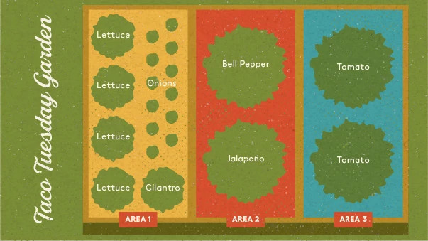 Use this planting plan as your guide to what goes, and grows, where in your Taco Tuesday Garden. Pay special attention to the distance between plants: Your garden may look small and sparse now, but it will be lush and overflowing in the blink of an eye.