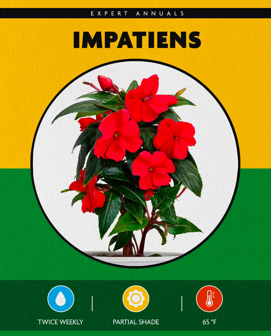Water: Needs a moderate amount of water, about 1-2 inches weekly. Keep soil evenly moist — Impatiens are not drought tolerant.