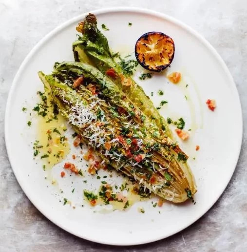 -- Heat the grill to medium-high heat. Slice the romaine hearts and lemon in half and coat lightly with vegetable oil. Grill the lettuce and lemon cut side down for 5 minutes or until charred.