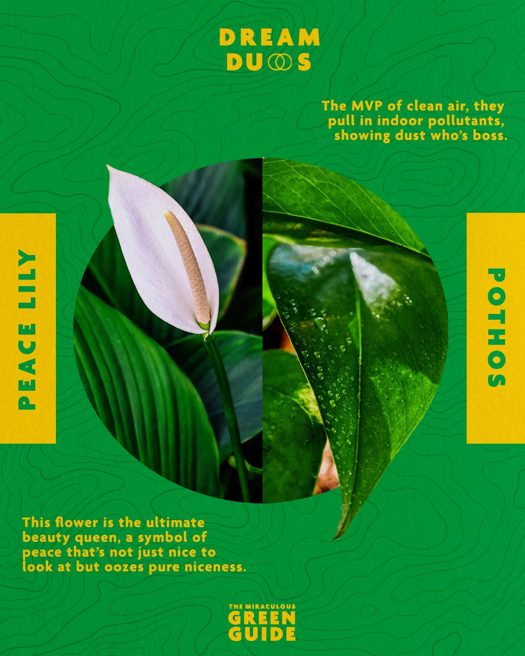 Peace Lily grows up while Pothos trails down – you can’t say opposites don’t attract! Place them in a bright room with indirect light, keep their soil consistently moist, and you’ll grow the happiest botanical besties that ever were.