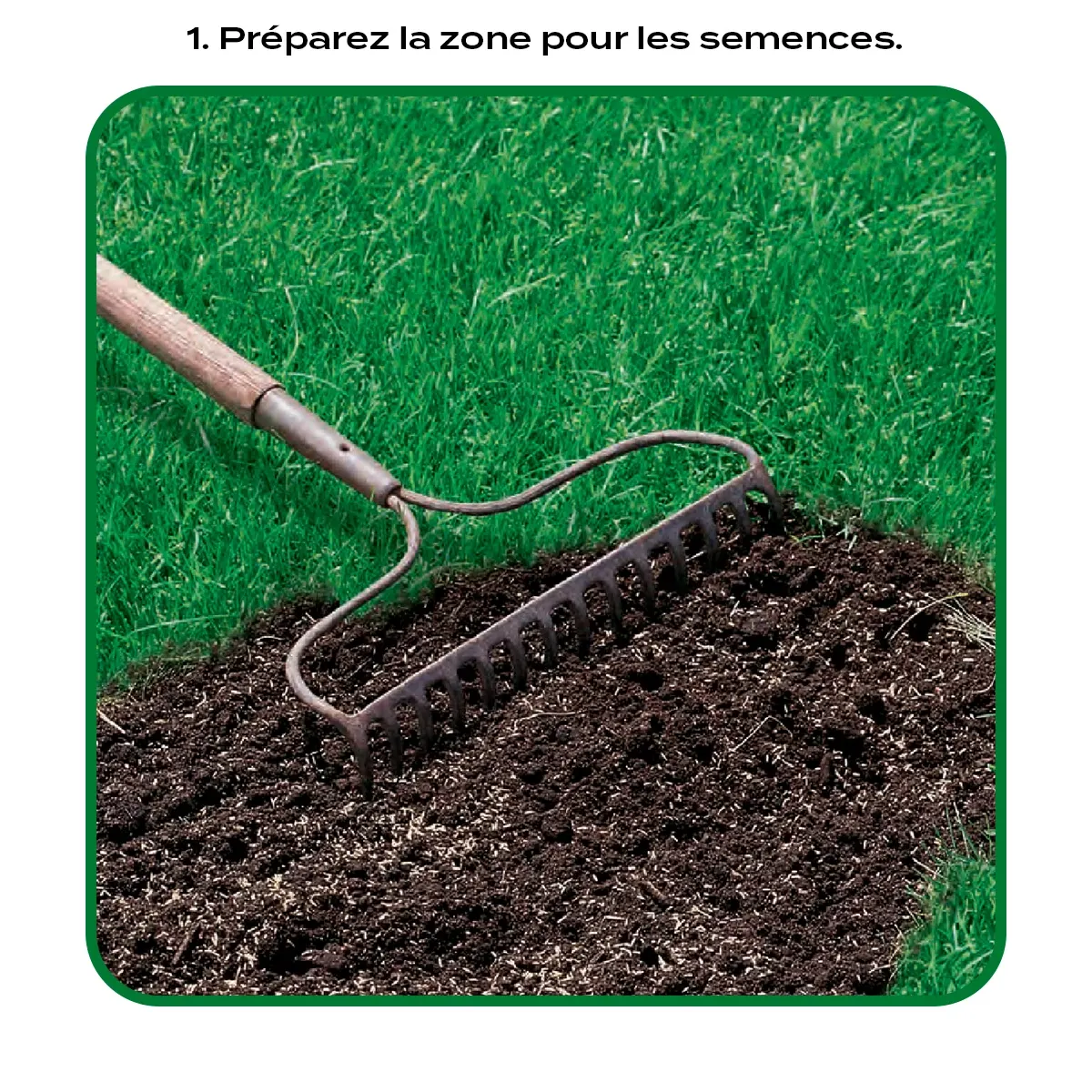 Pour de meilleurs résultats, utilisez un épandeur Scotts® selon les directives de l'étiquette. Ensuite, râtissez légèrement la zone pour assurer un contact entre les semences et le sol.